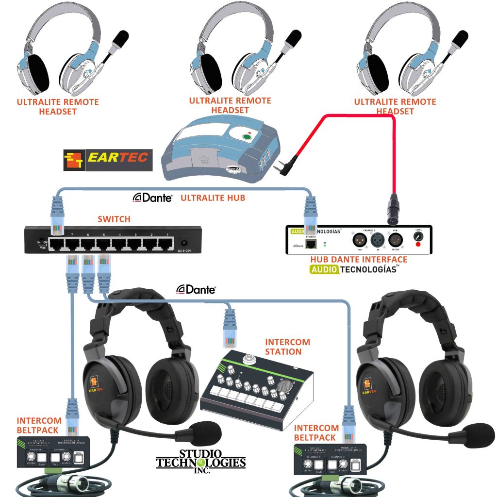 Ejemplo de una instalacion de un sistema inalambrico UltarLITE con HUB y un Intercom de Studio-Technologies Dante